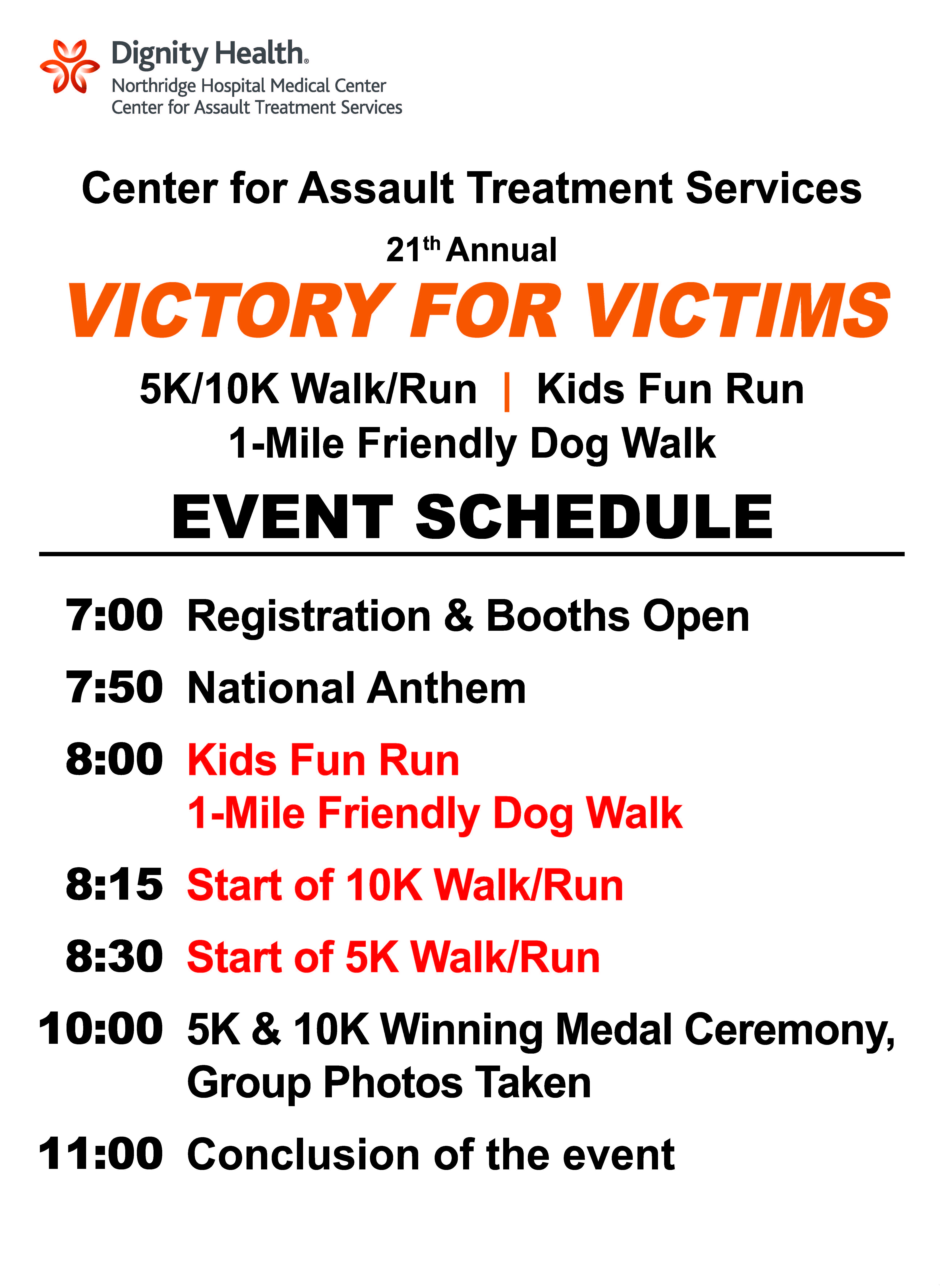For the last 20 years, thousands of participants have supported the Annual C∙A∙T∙S Walk/Run, raising money to support NHMC’s Center for Assault Treatment Services (C∙A∙T∙S) program. C∙A∙T∙S is a part of Dignity Health - Northridge Hospital Medical Center. It is the only 24/7/365 days a year immediate response program in the San Fernando and Santa Clarita Valleys providing forensic medical evidentiary examinations and interviews to victims of domestic, sexual assault, abuse, and human trafficking. We are also proud to be supporting our Medical Safe Haven (MSH) clinic which is the only program of its kind in Los Angeles that provides integrated medical and mental health services to victims of human trafficking.